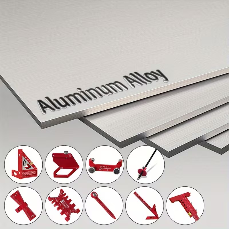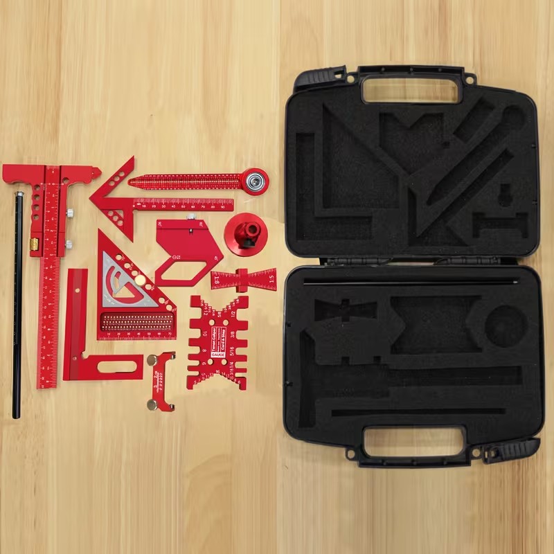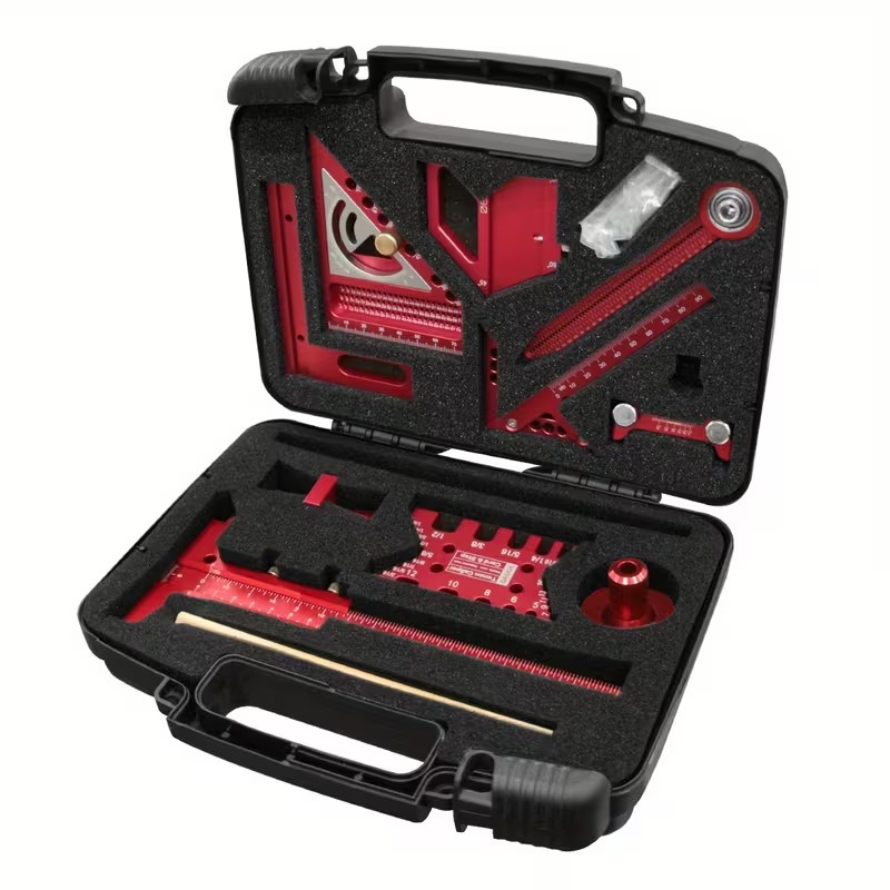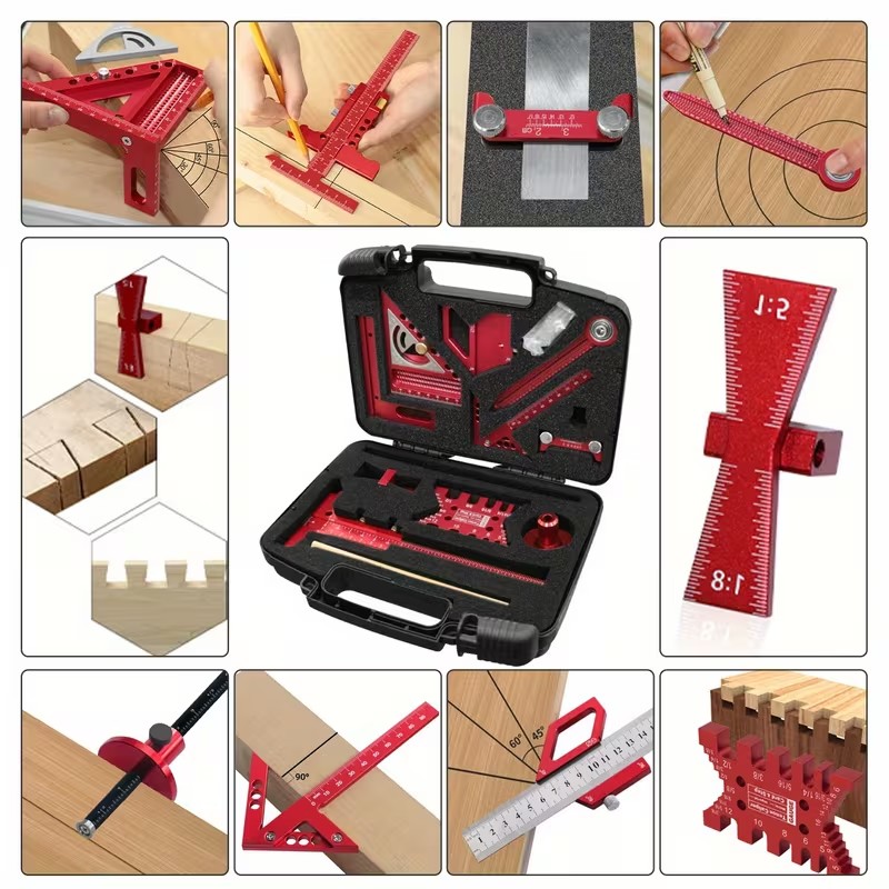 Szerszámkészlet különféle feladatokhoz, például deszkák illesztéséhez, rajzoláshoz, elrendezéshez, faragáshoz és csiszoláshoz; kényelmes és pontos használat, könnyen hordozható, és masszív alumíniumötvözetből készült;